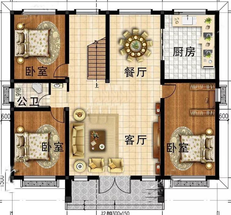一層的戶(hù)型設(shè)計(jì)方正規(guī)矩,進(jìn)門(mén)設(shè)計(jì)為客廳,面積適中,接待客人絲毫不顯擁擠。且設(shè)計(jì)了三間臥室,適合多口之家,搭配廚房餐廳,一樓設(shè)計(jì)空間利用很合理。