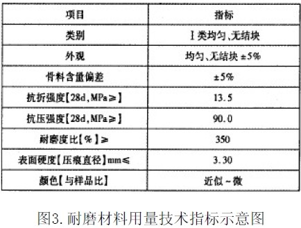 在工廠配置成半成品,現(xiàn)場施工用的干撒粉料。耐磨材料的用量主要根據(jù)說明書和設(shè)計(jì)要求來確定(其技術(shù)指標(biāo)如下圖3)。