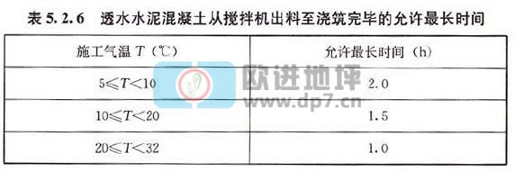 5.2.6透水水泥混凝土拌合物從攪拌機(jī)出料后,運(yùn)至施工地點(diǎn)進(jìn)行攤鋪、壓實(shí)直至澆筑完畢的允許最長時(shí)間,可由實(shí)驗(yàn)室根據(jù)水泥初凝時(shí)間及施工氣溫確定.并應(yīng)符合表5.2.6的規(guī)定。