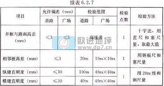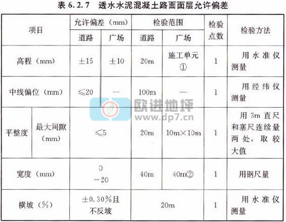 6.2.7透水水泥混凝土路面面層允許偏差應(yīng)符合表6.2.7的規(guī)定。