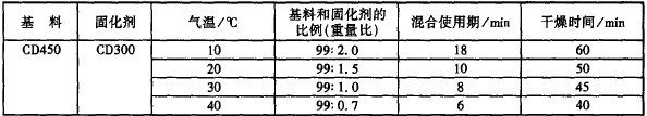 (一)預(yù)混:按比例將固化劑CD300加入基料CD450中.立即用電動(dòng)攪拌機(jī)低速攪拌均勻,混合比率、混合使用期及干燥時(shí)間隨溫度變化,溫度低時(shí)適量增加固化劑,溫度高時(shí)適量減少固化劑,參考數(shù)據(jù)如下表:(二)涂鋪:攪拌均勻后立即在鋪裝路面進(jìn)行耙涂施工,否則.超過混合使用期后.油漆因逐漸固化增稠而不能施工;涂布率:2.4 kg/m2( 膜厚1.5 mm)