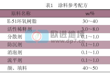 環(huán)氧樹脂E-51:工業(yè)級(jí),藍(lán)星化工新材料廠無(wú)錫樹脂廠;通用色漿:自制;超細(xì)天然硫酸鋇:工業(yè)級(jí)1.2涂料配方(見(jiàn)表1)