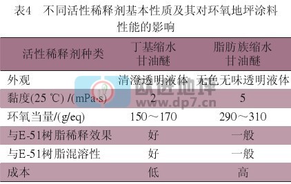 表4所示為不同活性稀釋劑基本性質(zhì)及其對(duì)環(huán)氧地坪涂料性能的影響。