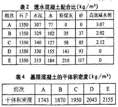 影響透水混凝土的技術性能的因素有透水方式、材料密度、原材料性能、配合比、成型方法和養(yǎng)護條件等:而對于透水混凝土來說,強度和透水性是對立的,在配合比設計時必須綜合考慮。表l列出了透水混凝土配合比設計中的各組參數(shù)。