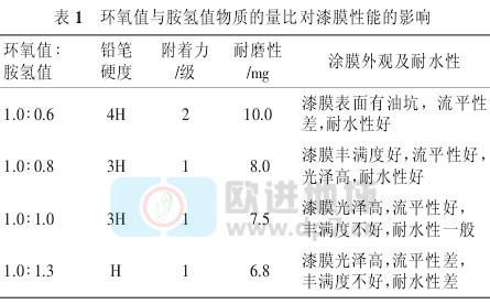 當(dāng)環(huán)氧值與胺氫值物質(zhì)的量比小于 1.0∶0.8 時(shí),漆膜的耐水性變差,不利于應(yīng)用。綜合考慮,環(huán)氧值與胺氫值物質(zhì)的量比為1.0 ∶ 0.8時(shí)涂膜的性能最佳。