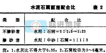 水泥石屑面層的主要成分是水泥和石屑,不摻砂或摻少量中砂,其厚度一般為20~30毫米,配合比及對材料的技術要求見表2。