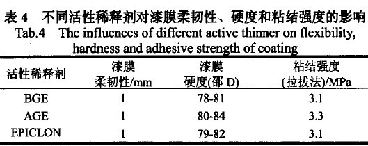 2.6不同活性稀釋劑對漆膜柔韌性、硬度和粘結(jié)強度的影響通過上述樹脂、固化劑、助劑和顏填料的選擇,我們得出了優(yōu)化后的無溶劑環(huán)氧自流平地坪涂料配方。以此配方為基礎(chǔ),保持其它條件不變,僅改變活性稀釋劑的種類,分別以BGE、AGE、EPICLON 703為活性稀釋劑制備了三個色漆(A組分),然后,采用NX.2009作為固化劑(B組分)分別制備涂膜,并測定它們的柔韌性、表面硬度以及與水泥基面的粘結(jié)強度,測試結(jié)果見表4。