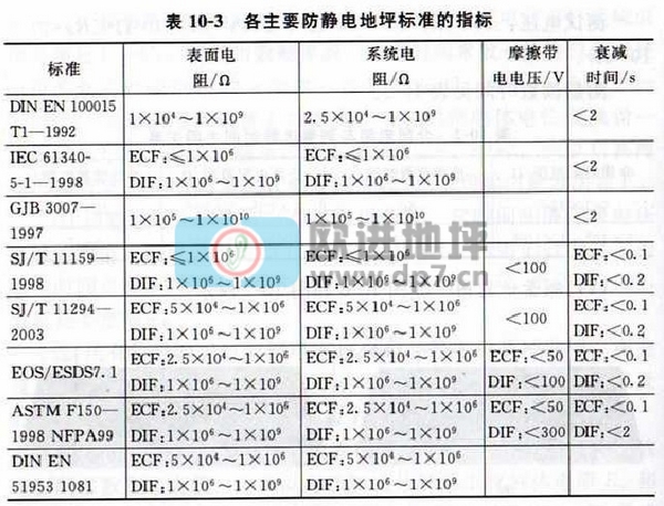 各個國家、各個組織制定防靜電地坪的標(biāo)準(zhǔn)稍有不同,但基本上都是按照地坪的電阻指標(biāo)來界定的,表為各主要防靜電地坪標(biāo)準(zhǔn)的指標(biāo)。