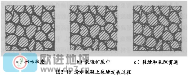 首先在應(yīng)力較小的情況下,由于水泥石的固結(jié)作用,混凝土體基本上保持初始狀態(tài),粘結(jié)面上的微裂縫總體沒(méi)有發(fā)生改變;隨著應(yīng)力的增加,過(guò)渡區(qū)的微裂縫開(kāi)始產(chǎn)生,隨著荷載的增加,裂縫的長(zhǎng)度和寬度加大,但這還沒(méi)有導(dǎo)致相互緊挨著的骨料間的粘結(jié)面的完全脫開(kāi),伴隨著這一過(guò)程,由于微裂縫的發(fā)展,骨料間存在著細(xì)微的位置調(diào)整,這期間會(huì)出現(xiàn)若干平臺(tái)區(qū),即應(yīng)變?cè)黾?,而?yīng)力不增加,甚至?xí)霈F(xiàn)應(yīng)力減小的情況,這種情況出現(xiàn)的原因是透水混凝土中存在大量的孔隙,當(dāng)壓力超過(guò)一定界限時(shí),混凝土體內(nèi)存在著明顯的應(yīng)力重分布的情況:最后當(dāng)應(yīng)力進(jìn)一步加大,裂縫的進(jìn)一步擴(kuò)展,直至骨料間的水泥石粘結(jié)面完全斷開(kāi),裂縫和混凝土體中的孔隙貫通,導(dǎo)致混凝土的最終破壞,破壞過(guò)程如圖2所示。