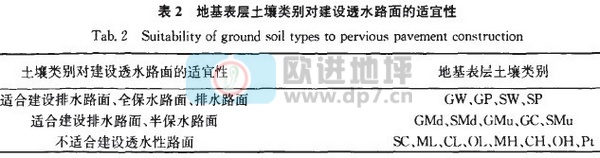 透水地坪路面的工程選址與類型選擇之地質(zhì)條件,地質(zhì)條件主要指原地基土的性質(zhì),調(diào)查地質(zhì)條件可確定2大問題:其一,原地基是否適合建設(shè)透水路面;其二,若可建設(shè),宜建何種類型的透水路面.目前,美國、臺灣等地均按照《Standard Practice for Description and Identification of Soils(Visual——Manual Procedure)》(ASTM 1")2488—2006)進行透水路面地層土壤的描述與鑒別,該法先進行地表土層取樣,制成非原狀土樣后進行目視一手工操作鑒別,最后按統(tǒng)一土壤分類法分類.據(jù)國外經(jīng)驗,可將地基土按適宜建設(shè)透水路面程度的不同分為表2所示的3類.由其可見,適宜建設(shè)透水路面的多為砂性土地基,粉土、飽和度較高的粘性土則不宜建設(shè),這一結(jié)論值得我國參考.當(dāng)土基不符合要求,但又必須建設(shè)時,應(yīng)先對地基進行加固處理、甚至是換土。