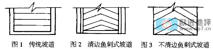 圖2為清邊魚刺式防滑坡道,圖3為不清邊魚刺式防滑坡道。采用清邊魚刺式防滑坡道時,兩邊的流水溝要到底,其作用就是把上面坡道上的水排除干凈。使用這種坡道,效果很好。歐進地坪專業(yè)施工停車場車庫無震動止滑車道。
