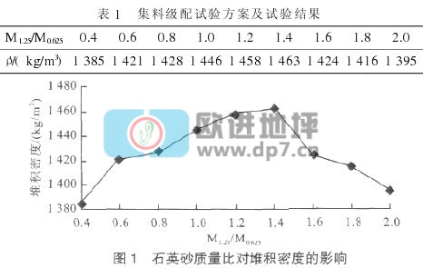 集料的級配對材料的強度、工作性、耐久性有著較大的影響,將兩種粒級石英砂以不同質量比(M1.25/M0.625)進行混合,測試其堆積密度(ρ'),并選擇最大堆積密度所對應的比例對兩種粒級石英砂進行摻配,可使地坪硬化劑在固定膠凝材料用量的基礎上盡量致密并減少干縮。試驗結果見表1。如圖1所示,混合后的集料堆積密度隨M1.25/M0.625的變化而呈拋物線規(guī)律變化,其最大點位于M1.25/M0.625為1.4處,最大堆積密度為1 463 kg/m3。