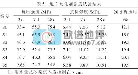 地面硬化劑強度試驗的配合比見表4。試件的成型按JC/T 906—2002《混凝土地面用水泥基耐磨材料》中有關規(guī)定進行。砂漿成型后先在溫度(20±3)℃、相對濕度80%以上的條件下濕養(yǎng)護2d,再放入(20±1)℃的水中養(yǎng)護5d,之后置于(20±3)℃、相對濕度60%的條件下養(yǎng)護21d。按GB/T17671—1999《水泥膠砂強度檢驗方法(ISO法)》進行強度試驗,結果列于表5中。