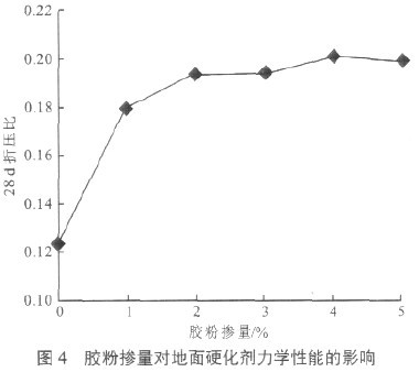 (3)如圖4所示,28d折壓比隨膠粉摻量的增加呈上升趨勢,當膠粉摻量為1%、2%時折壓比快速增長,超過3%的摻量時,折壓比增長緩慢,折壓比可提高64.5%??梢哉J為適當摻量的膠粉可明顯地改善地面硬化劑的韌性。