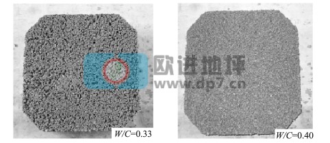 從圖1 可以看出,高透水混凝土的抗壓強度隨著水灰比的增大而增大,而到一定值時( 6 ~ 8 粒級為0. 31) ,強度開始降低。當水灰比較小時,水泥漿較少,而不能完全包裹在骨料的表面,甚至有的部位出現(xiàn)散粒體狀況,水灰比為0. 25 時,通過抗壓試驗后的現(xiàn)象表明,大多數(shù)顆粒都處于散粒狀態(tài)。因此,強度較低時,若水灰比再小,拆模后,試塊不能成型。當水灰比達到0. 31 時,透水混凝土的強度達到最大值,此時,水泥漿包裹在骨料顆粒的表面,新拌的透水混凝土處于凝團狀態(tài),沒有水泥漿液流動,處于比較理想的狀態(tài)。當水灰比高于0. 31 時,透水混凝土的抗壓強度開始下降。當水灰比大到一定程度時,水泥漿液開始出現(xiàn)流動,當成型時,即使不采用振搗,水泥漿液也會在自重的作用下,流動到試件的底部,使得底部強度較大,而上部骨料粘結(jié)性能較差,導致強度下降,如圖2 所示。