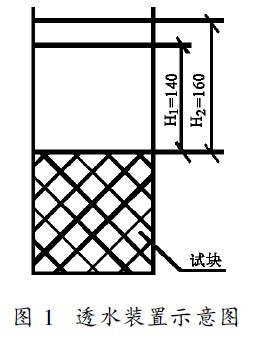 透水系數的測定: 本試驗采用自制的透水裝置(圖1), 為了測定試塊成型方向的透水性能, 將試件的四周側面用蠟進行密封處理, 再與透水裝置連接并用蠟密封連接處, 確保裝置中的水沿混凝土內部連通孔通過, 在透水裝置中加入大于200mm高的水, 測定水位從160mm 降至140 mm時的時間v t1 和水位從160mm 降至0時的時間v t2, 計算定水位透水系數v1 和變水位透水系數v2。透水系數的計算公式為: v =H /v t; v) ) ) 透水系數, mm / s, H ) ) ) 水位下降高度, 定水位為20 mm、變水位為160 mm; v t) ) )水位下降時經歷的時間s。